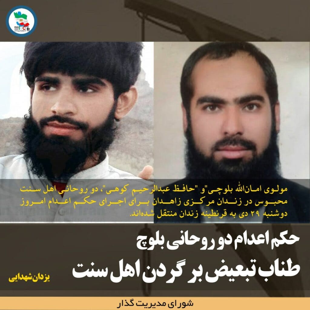 “مولوی امانالله بلوچی”و “حافظ عبدالرحیم کوهی”، دو روحانی اهل سنت محبوس در زندان مرکزی زاهدان برای اجرای حکم اعدام امروز دوشنبه ۲۹ دی به قرنطینه زندان منتقل شدهاند.