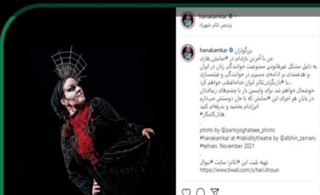 هانا کامکار، خواننده، نوازنده و بازیگر با انتشار عکسی از آخرین فعالیت بازیگریاش در صحنه تئاتر در اینستاگرامش نوشت: «به دلیل ممنوعیت خوانندگی زنان در ایران و هدفمندی بر ادامه مسیرم در خوانندگی و فیلمسازی، با بازیگری تئاتر ایران خداحافظی خواهم کرد.»