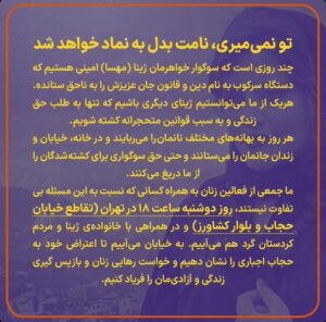 ما جمعی از فعالان اجتماعی، روز دوشنبه ساعت ۱۹ در رشت، خیابان مطهری، چهارراه حاجیآباد در همراهی با خانوادهی ژینا و مردم کردستان و در اعتراض به خشونت گسترده علیه زنان گرد هم میآییم. به خیابان میآییم که یادآور شویم مبارزه برای حمایت از آینده و زندگی زنان در شرایطی که حتی حق انتخاب و زندگیشان در آن تأمین نشده است، ضروری است. میآییم تا بار دیگر بر حق تعیین سرنوشت خود تاکید کنیم.»