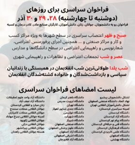 در همین راستا و برای تداوم و پیشروی انقلاب جاری در ایران، لازم میدانیم بار دیگر سه روز ۲۸، ۲۹ و ۳۰ آذر (دوشنبه تا چهارشنبه) را به عنوان روزهای فراخوان سراسری اعلام کنیم.