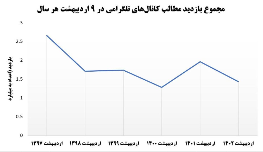 بر اساس این نمودار، میتوان گفت که بهطور طبیعی میزان استفاده از تلگرام یکسال پس از فیلترینگ آن کاهش محسوسی داشته است که بیانگر خروج برخی از کاربران از تلگرام پس از فیلترینگ است. اما از آن زمان تاکنون و در طول ۴ سال اخیر، میزان بازدید مطالب کانالهای تلگرامی اگرچه با افتوخیز روبرو بوده اما با کاهش محسوسی روبرو نبوده است. در نظرسنجیهایی که ایسپا نیز در رابطه با مصرف تلگرام داشت، در سالیان اخیر همواره حداقل یک سوم از ایرانیان از تلگرام استفاده میکردند.