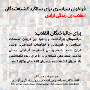از این رو فراخوان ما شبکه سراسری انقلاب زن زندگی آزادی (شامل تشکلهای دانشجویی، دانش آموزی و گروههای مبارزاتی شهری جوانان و زنان) به عموم جوانان، زنان، رنگینکمانیها، دانشجویان، دانشآموزان، کارگران، معلمان، کادر درمان، خانوادههای دادخواه، آتئیستها و تمام کسانی که طرفدار یک جامعه با آزادیهای بیقید و شرط سیاسی هستند، این است که در سالروز قتل کشتهشدگان انقلاب، به صورت فعالانه و به هر شکل ممکن، با خانوادههای داغدیده همراهی کنیم.