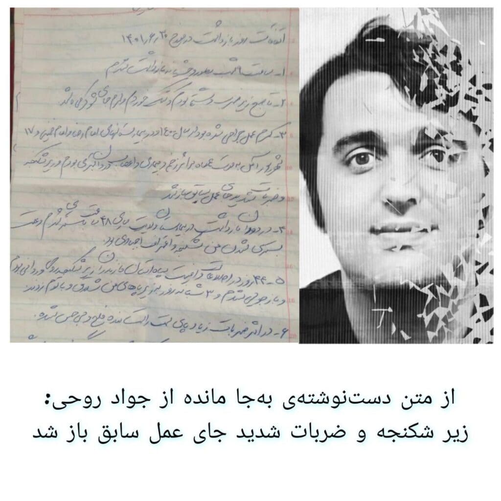 آتنا دائمی، فعال حقوق بشر و زندانی سیاسی سابق، دست‌نوشته‌هایی از جاویدنام جواد روحی منتشر کرده که بیانگر شکنجه‌شدن او در زندان است