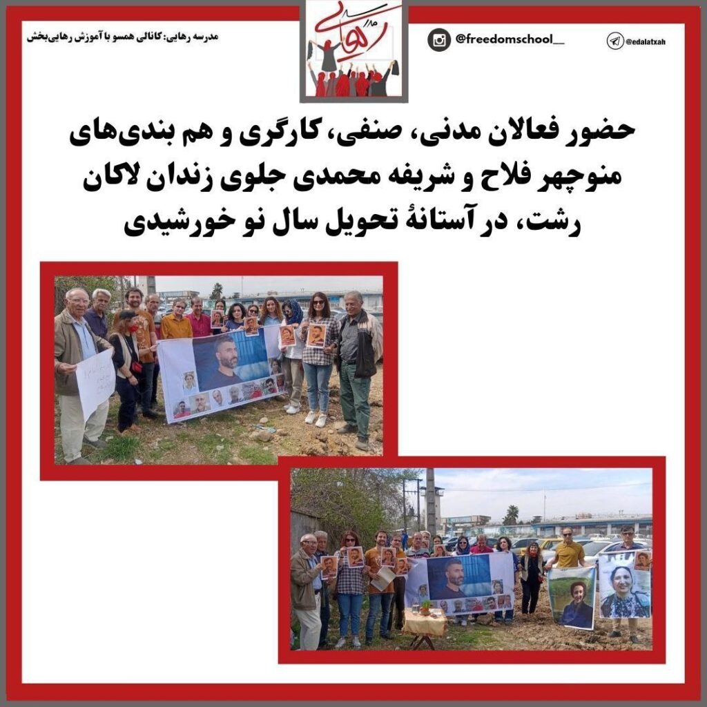 حضور فعالان مدنی، صنفی، کارگری و هم بندی‌های #منوچهر_فلاح و #شریفه_محمدی جلوی زندان لاکان رشت، در آستانهٔ تحویل سال نو خورشیدی