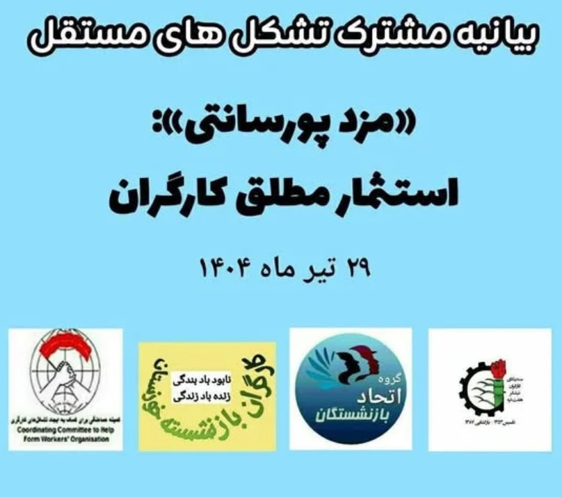 اِعمال ستم مزدی زیر عنوان «پورسانت کاری »، شدت بخشیدن بر روند انجام کار، افزایش ساعات کار، اضافه کاری اجباری، عدم پرداخت مزد در روزهای تعطیل و اجبار کارگران برای حاضر شدن به سرکار (حتی در شرایط بمباران و نبودن پناهگاه امن)، سیاست تعدیل نیرو، حذف مزایای شغلی و غیره،همگی به ویژه پس از جنگ اسرائیل و ایران توسط کارفرماها افزایش یافته اند. طبقات استثمارگر و حاکمان خدمتگزار آنها در ایران که خود همچون رژیم های اسرائیل و آمریکا در برافروختن آتش جنگ نقش دارند، در همان حال بی شرمانه با سوء استفاده از شرایط جنگی و شرایط پس از آتش بس، می کوشند تا آنجا که امکان دارد فشار بر کارگران را افزایش دهند.