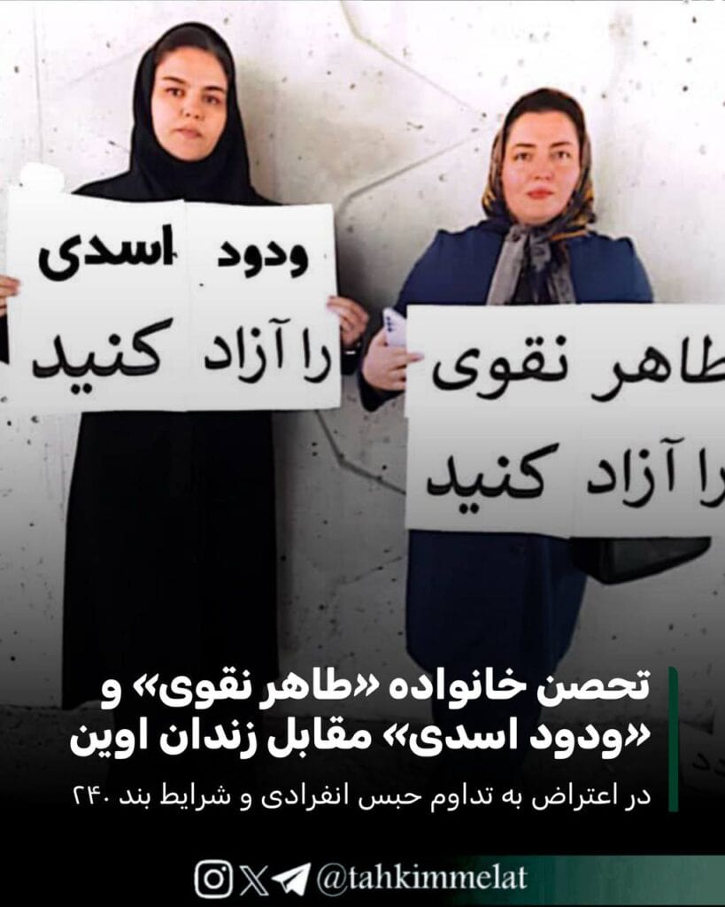 امروز جمعی از اعضای خانواده «طاهر نقوی» و «ودود اسدی» با حضور مقابل درِ اصلی زندان اوین دست به تحصن زدند. این تجمع اعتراضی در واکنش به انتقال این دو زندانی سیاسی به بند ۲۴۰ و ادامه بیخبری از وضعیت سلامتی آنان برگزار شد. خانوادهها اعلام کردهاند که تا زمان دریافت اطلاعات دقیق و تضمین حقوق قانونی عزیزانشان، به اعتراض مدنی خود ادامه خواهند داد.